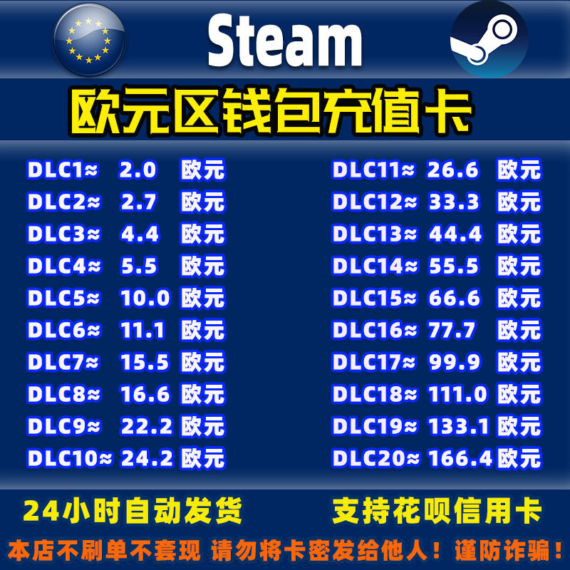 Steam西班牙德国法国欧元区充值卡欧盟区钱包余额充值码CDK兑换码