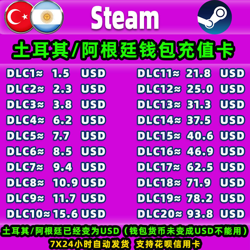 Steam土耳其阿根廷充值卡cdk账户充钱卡钱包充值码礼品卡美金余额