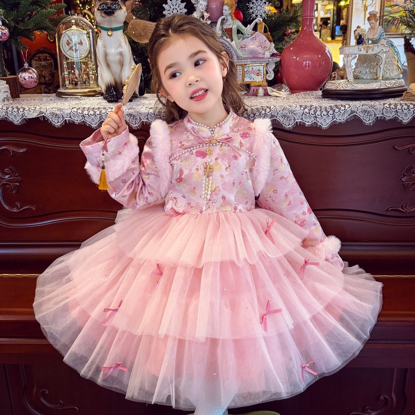 女童加绒旗袍裙冬2026新款儿童新中式织锦网纱蓬蓬公主裙连衣裙子