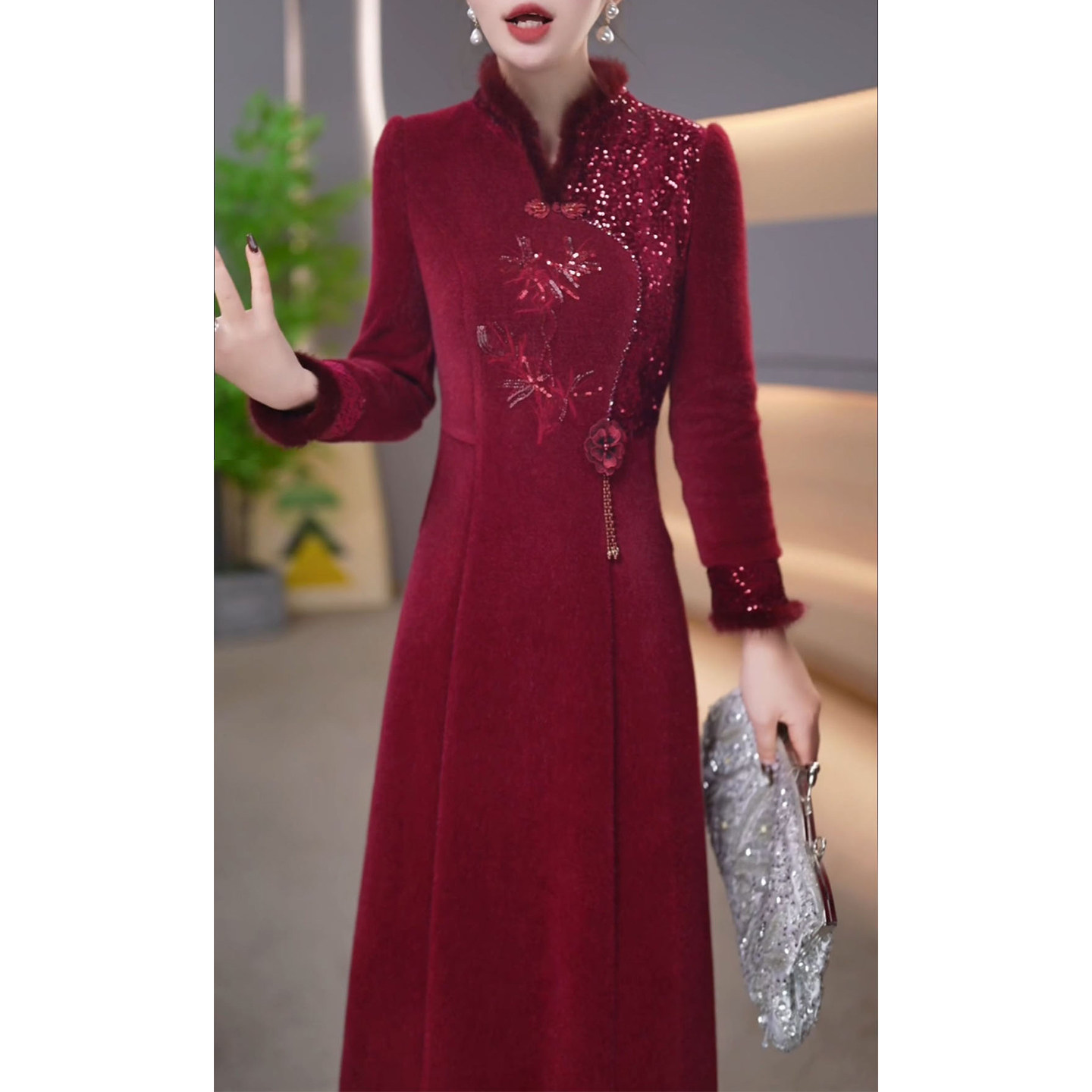 国风加绒加厚长袖连衣裙女2025秋冬新款妈妈显瘦气质婚宴礼服裙子