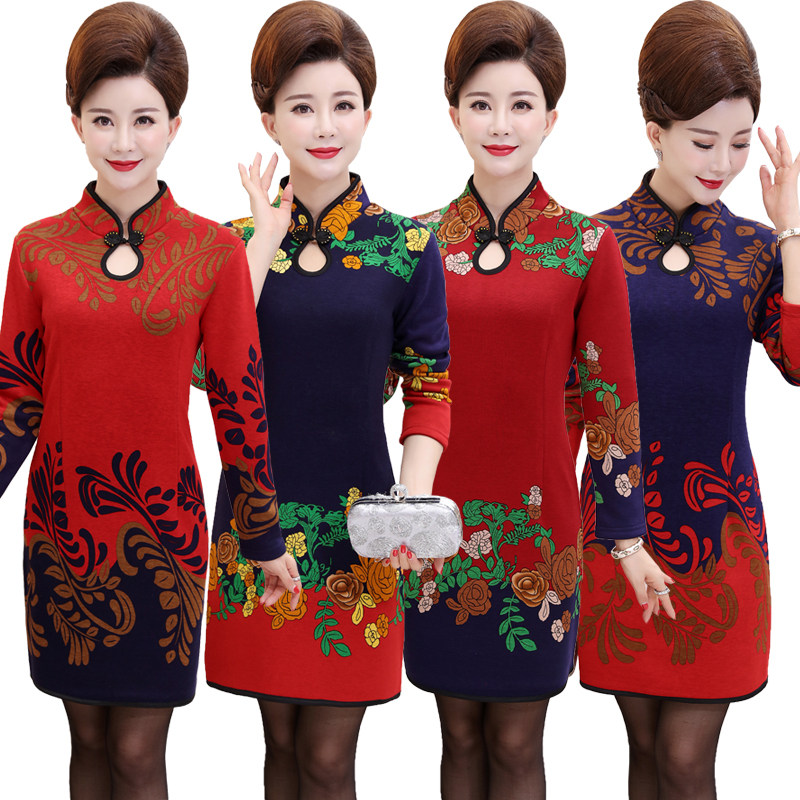 妈妈装秋冬长袖打底衫中老年女装中长款改良旗袍加绒厚连衣裙5xl