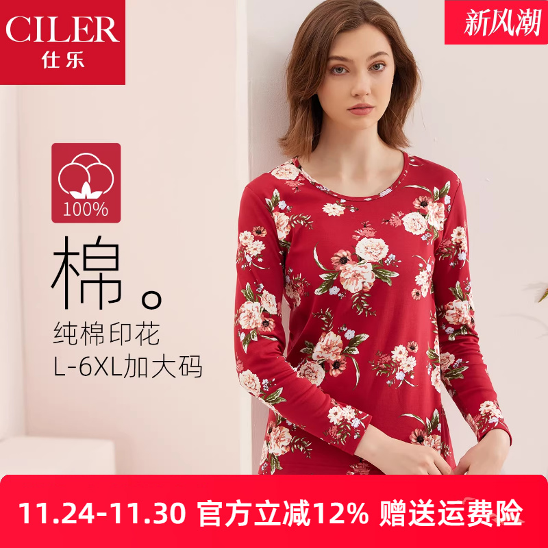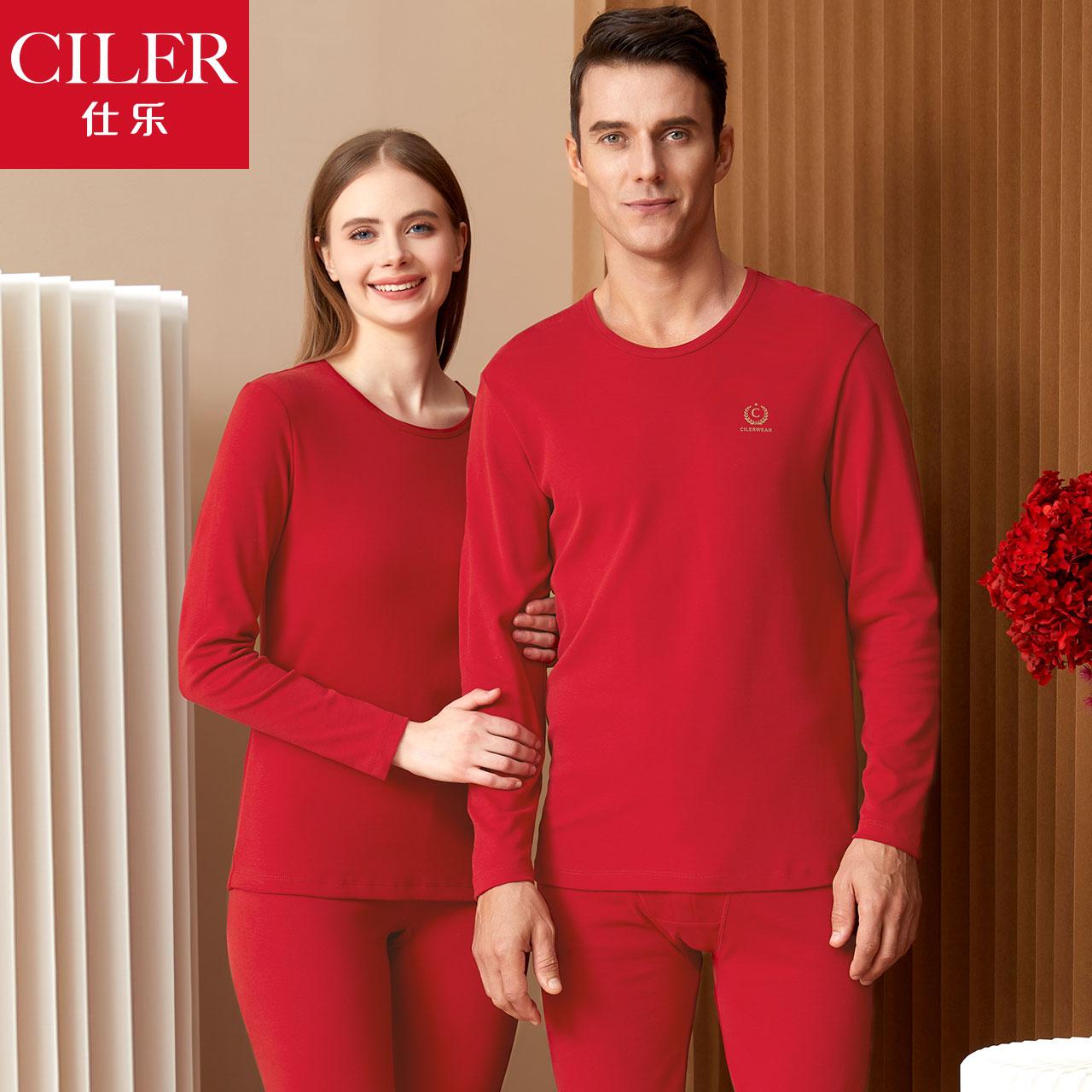仕乐纯棉大红色本命年内衣套装男款圆领秋衣秋裤女士线衣线裤大码