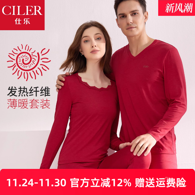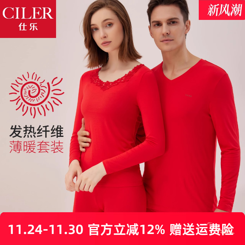 仕乐超薄款发热莫代尔保暖内衣男秋衣秋裤女大红色本命年套装马年