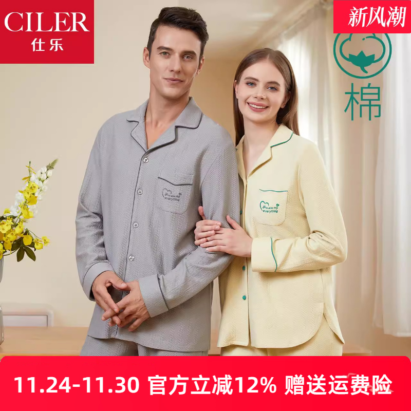 仕乐冬季情侣款加厚保暖睡衣女空气夹棉家居服套装男士纯棉可外穿