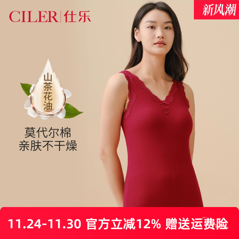 仕乐茶花油棉莫代尔背心女士蕾丝V领内搭打底红色本命年春秋冬季