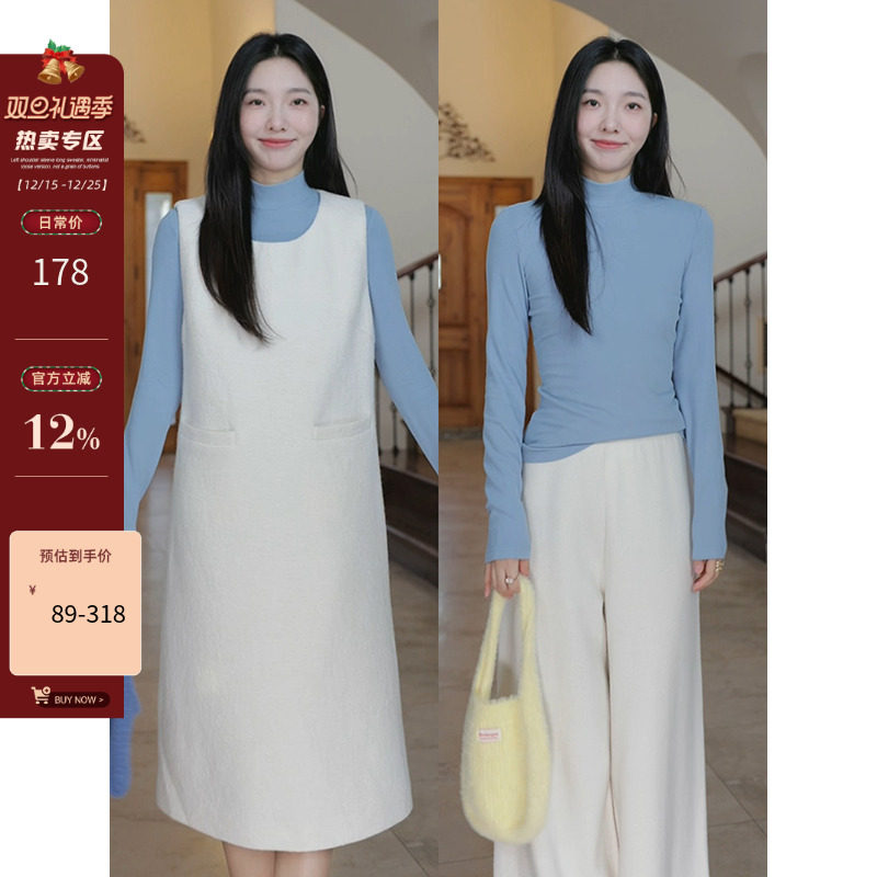 【直播专享】菲梦伊时尚套装女冬高领打底衫T恤背心连衣裙两件套