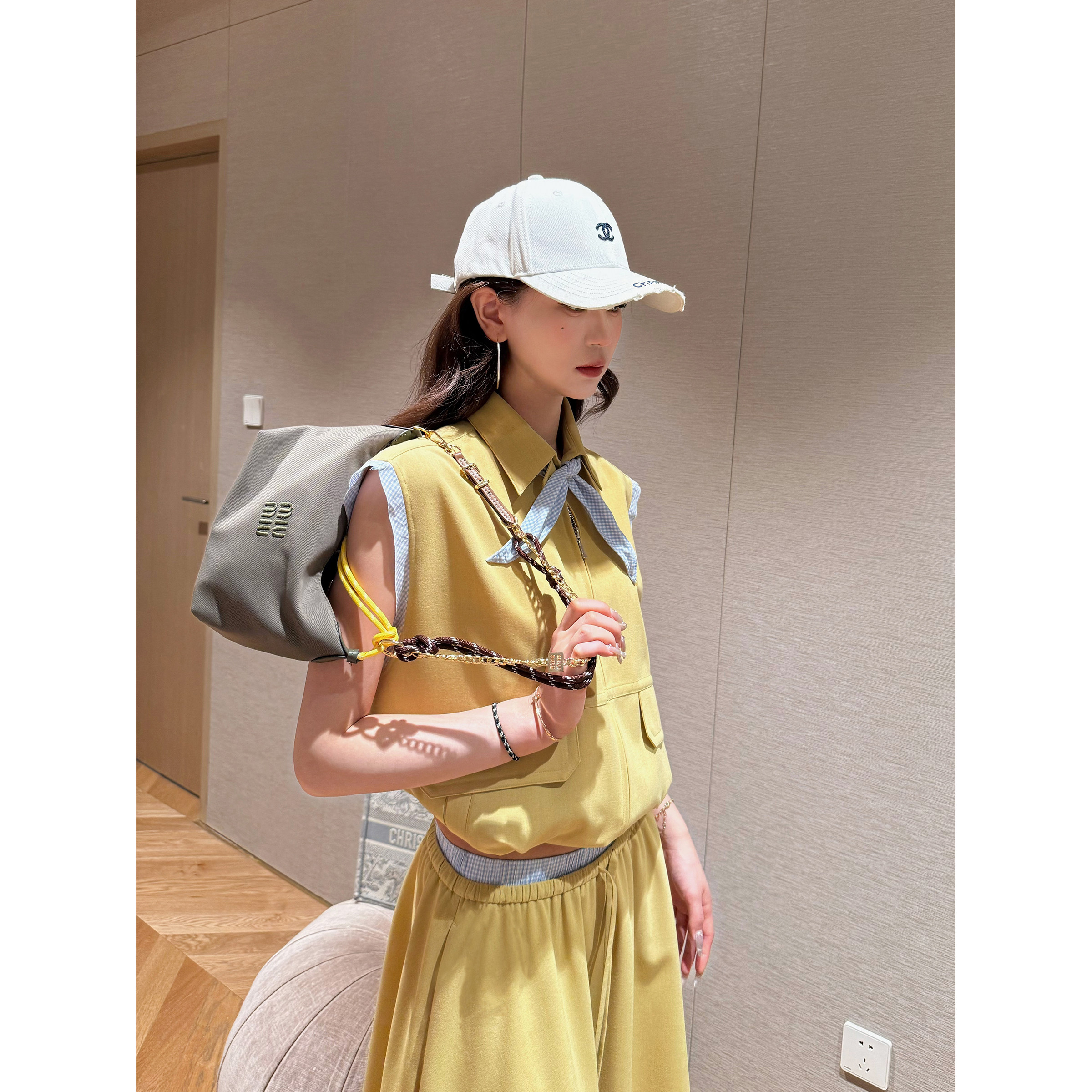 NancyCavally专柜款爽滑肌理花纱 miu系撞色可拆兔耳领结工装套装