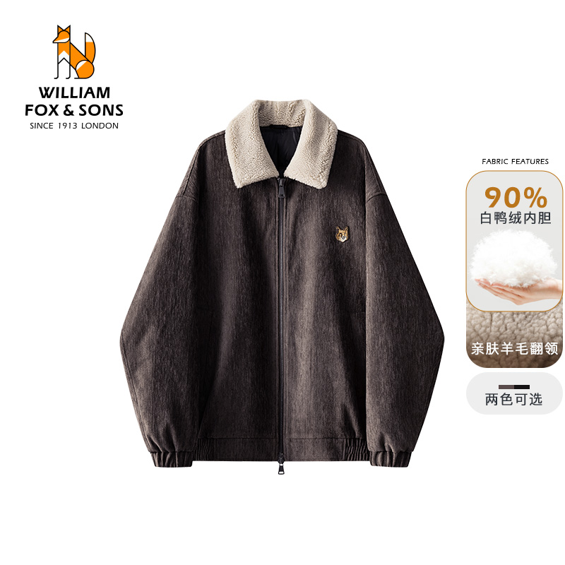 威廉福克斯冬季加厚复古底特律羊毛翻领羽绒服保暖情侣夹克外套男