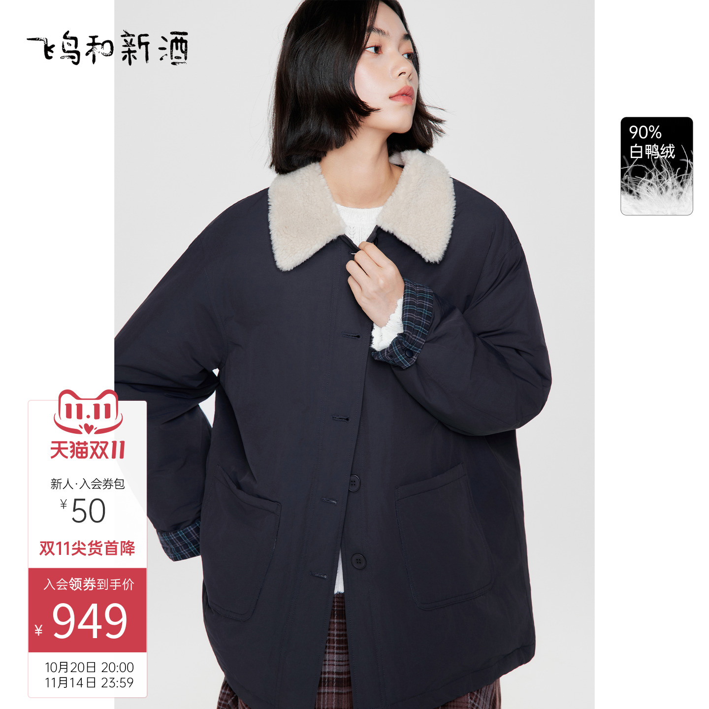 飞鸟和新酒毛毛领宽松翻领羽绒服2025冬季新款保暖白鸭绒外套女
