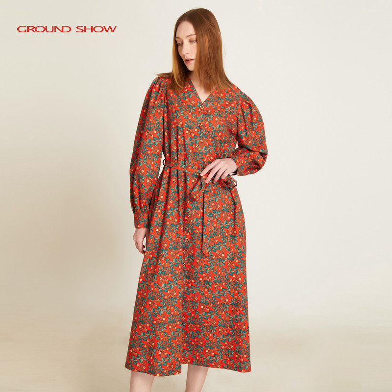【100%棉】阁兰秀红色印花连衣裙长袖V领系带收腰显瘦碎花衬衫裙