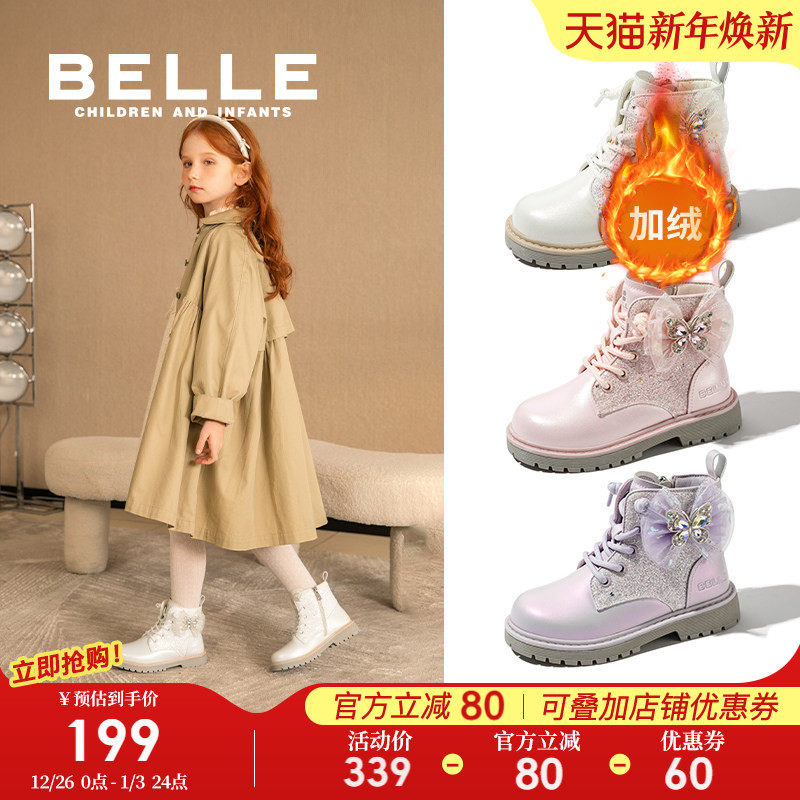 百丽童鞋小女孩公主靴女童马丁靴冬季2025新款加绒保暖时尚短靴子