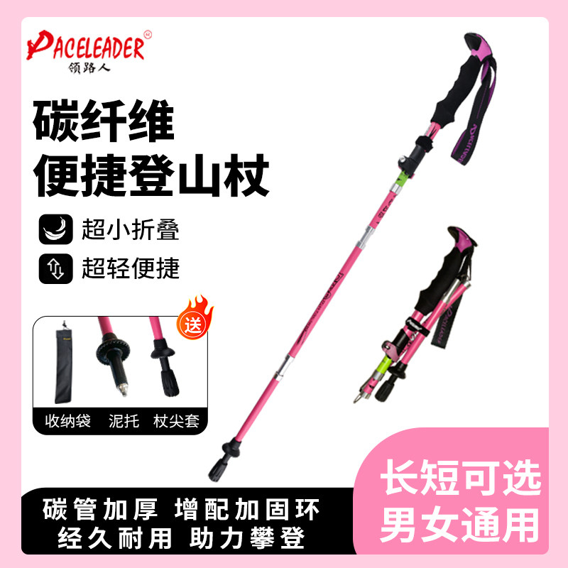 领路人碳纤维登山杖碳素超轻户外专业徒步防滑折叠越野手杖粉色女