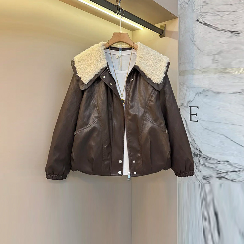 胖妹妹加肥毛毛翻领长袖皮外套大码女装冬季款欧洲站宽松百搭上衣
