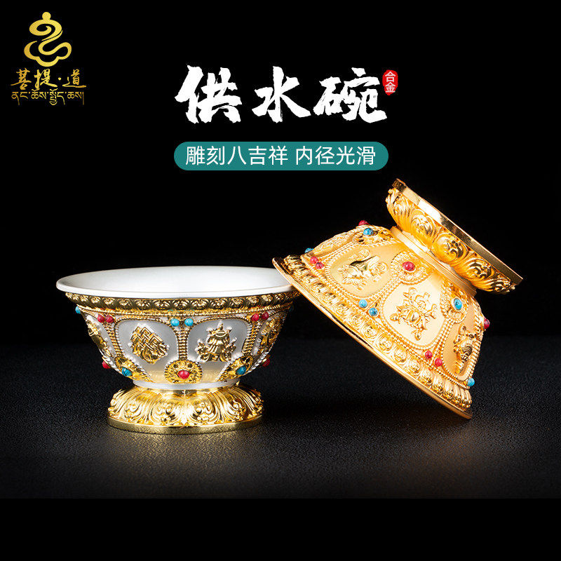 佛前供水杯供佛 鎏金镶嵌宝石合金八吉祥七供水碗八供圣水杯摆件