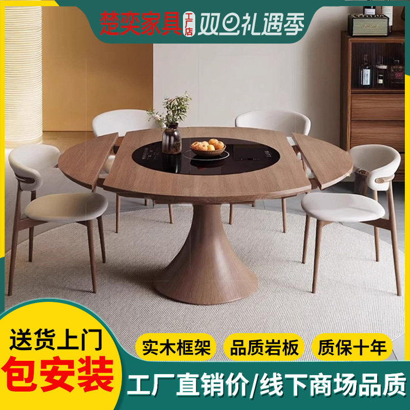中古风实木多功能餐桌家用电磁炉暖菜板可伸缩折叠火锅圆桌白蜡木