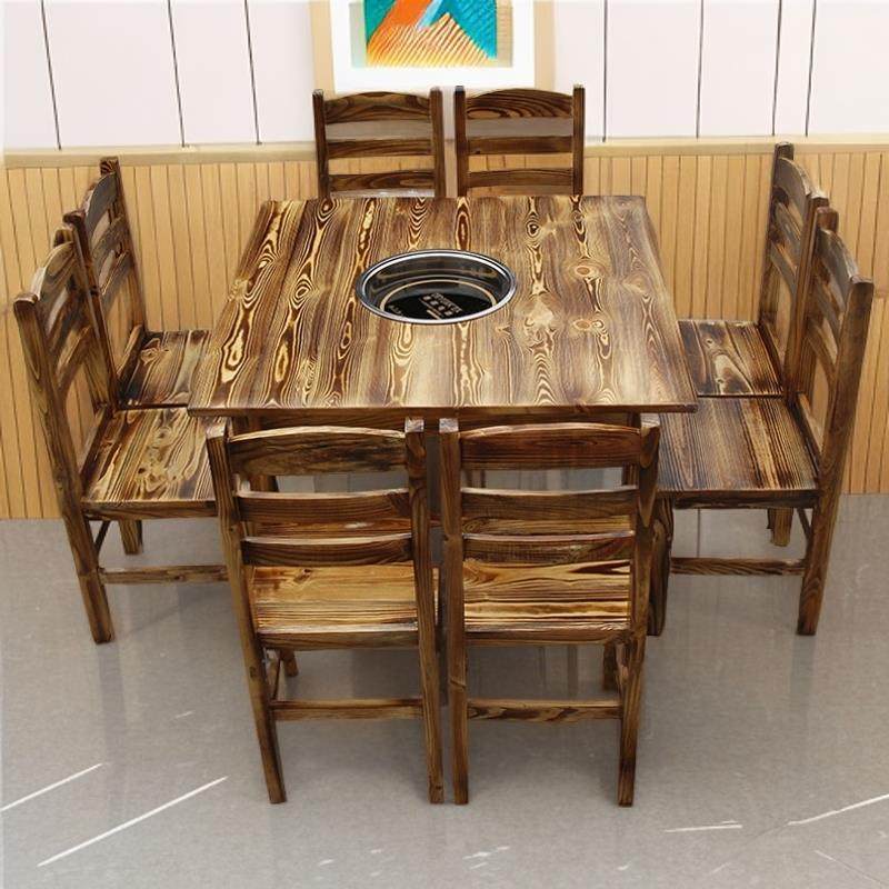 炭化实木火锅桌椅长方桌下沉电磁炉一体饭店方桌烤肉正方桌烧烤桌
