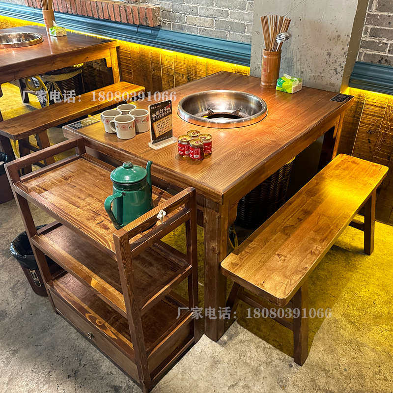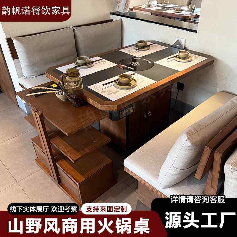 实木火锅桌商用山野风餐厅桌椅组合无烟火锅桌子电磁炉一体中餐桌