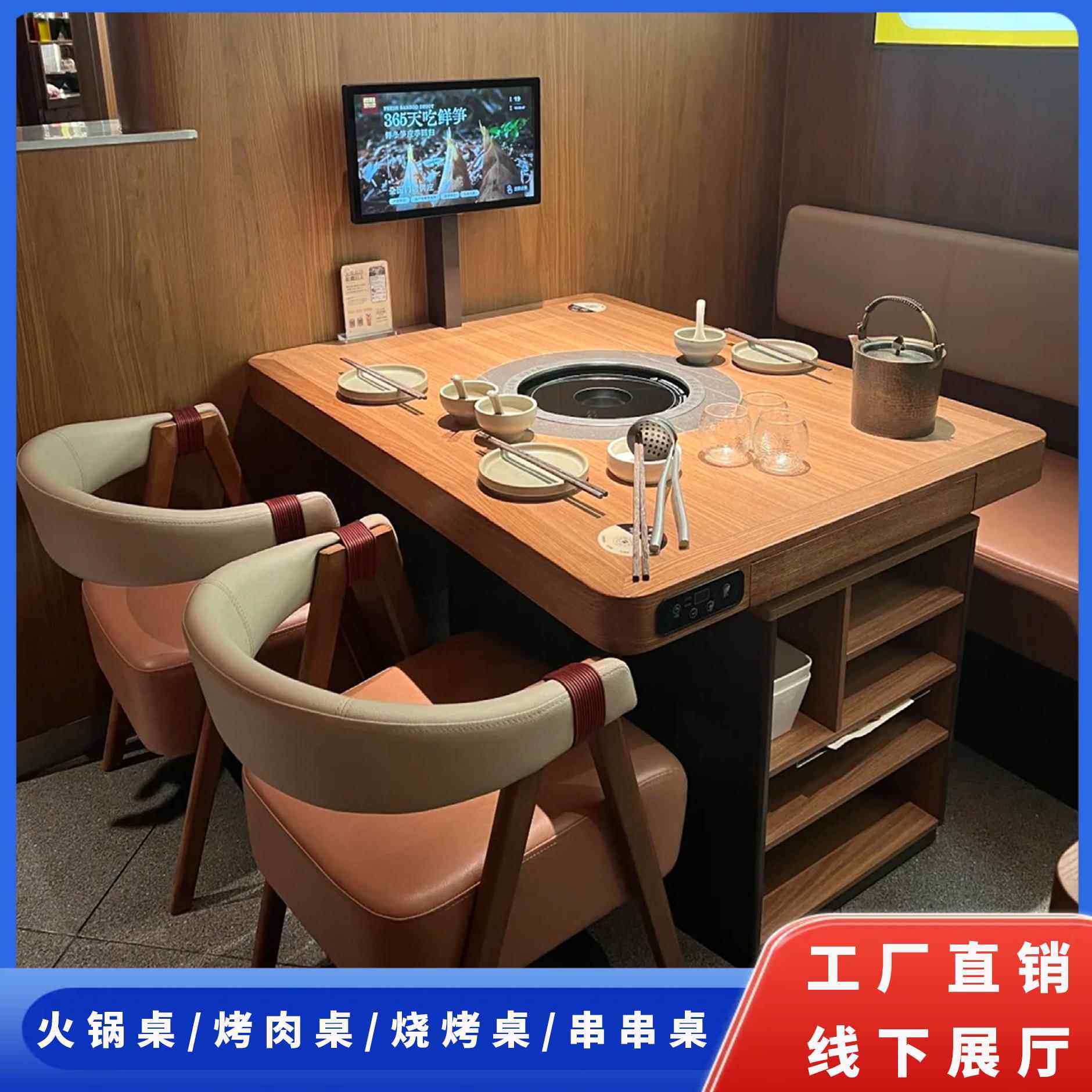 实木火锅桌大理石岩板烤肉串串桌电磁炉一体餐饮桌椅卡座商用定制
