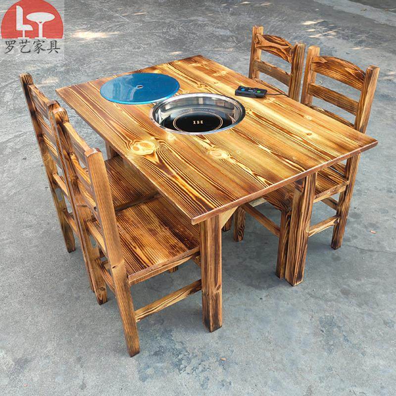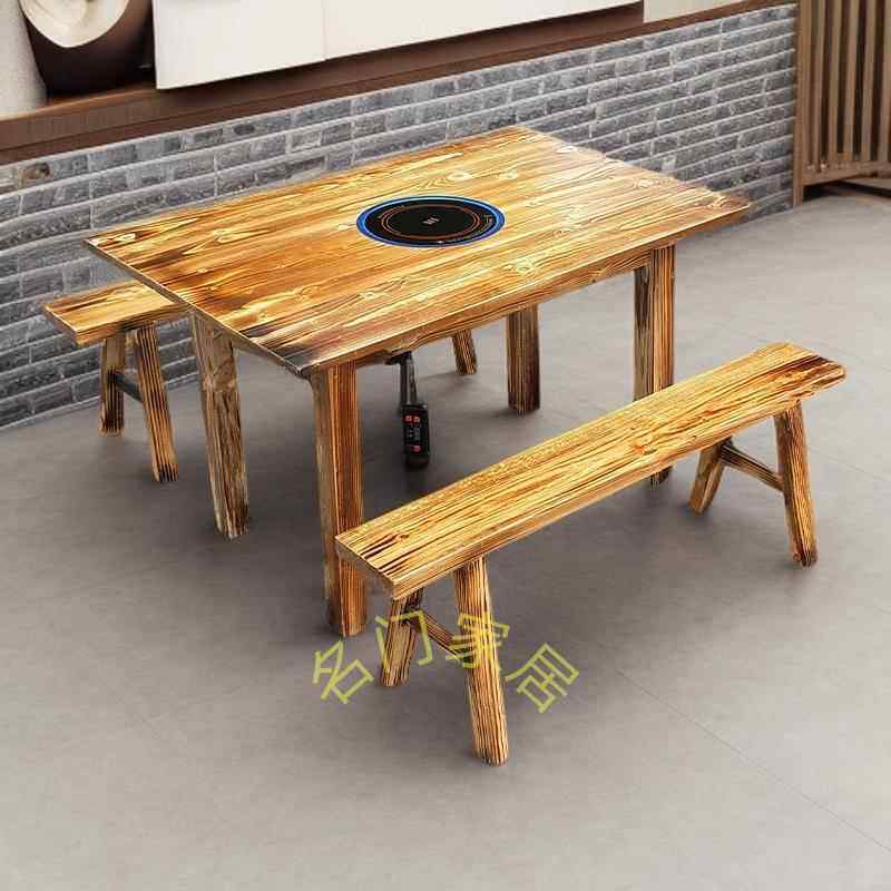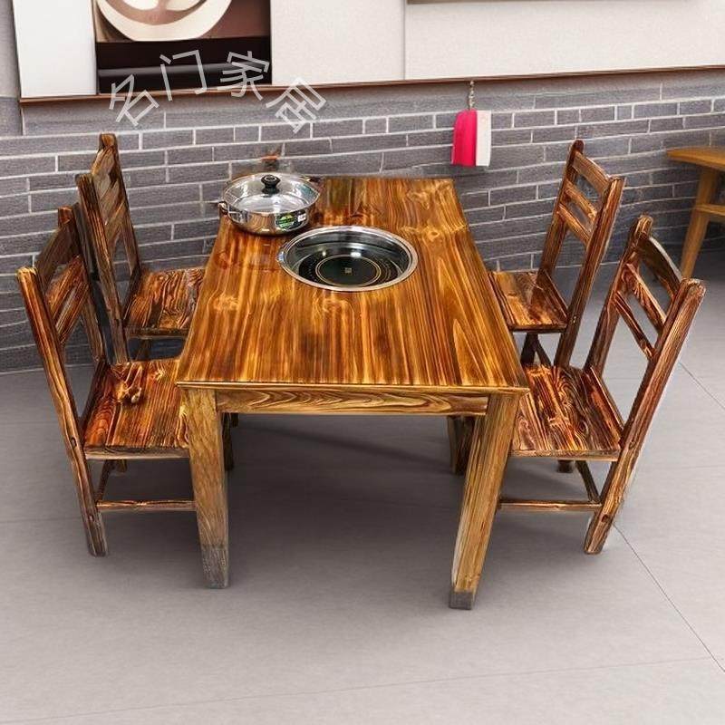 碳化实木火锅桌电磁炉一体餐饮大排档桌椅商用火锅桌下沉式火锅桌