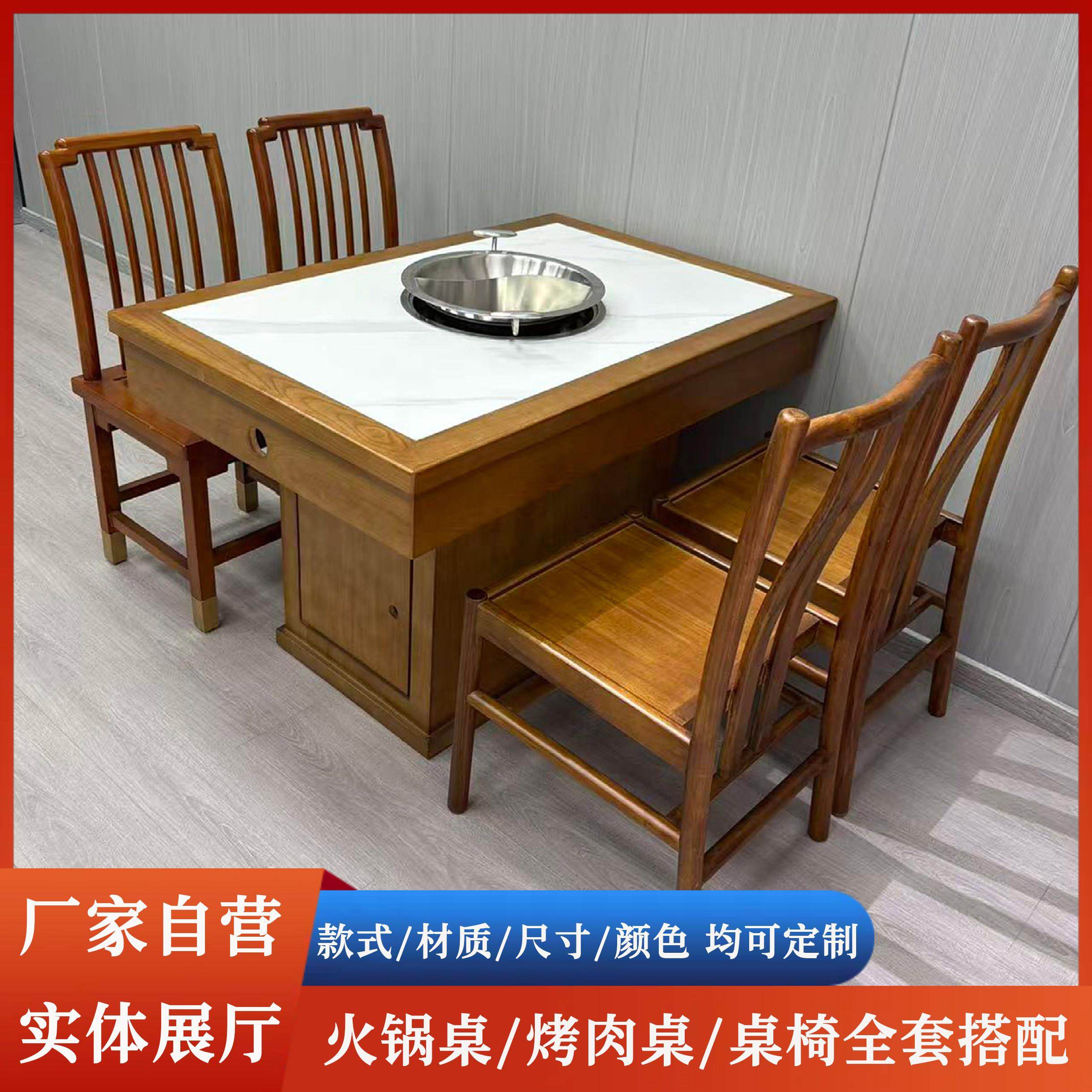 实木火锅桌大理石饭店餐馆桌椅组合火锅桌子电磁炉一体无烟家商用