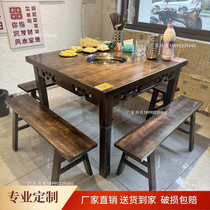 实木火锅桌椅组合商用烧烤桌子电磁炉一体火锅桌正方桌小吃店饭店