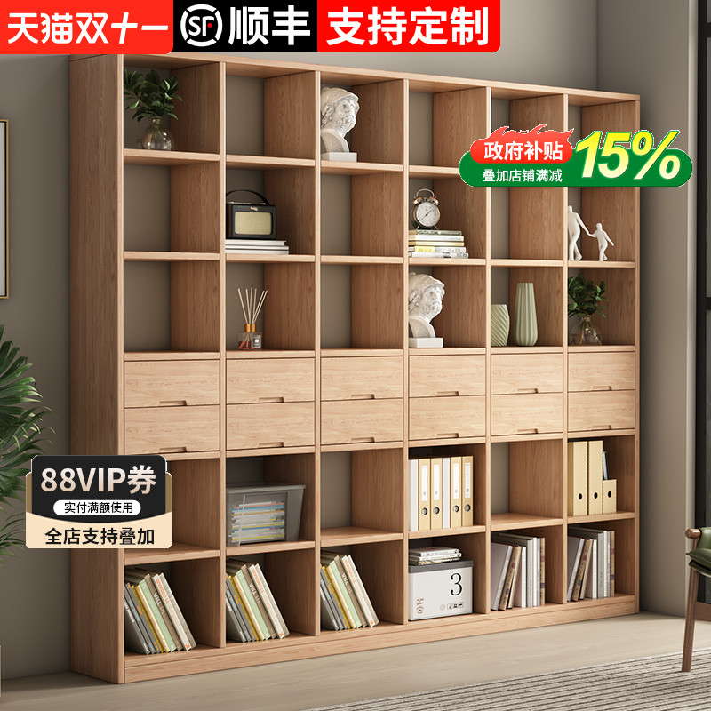 书架一体靠墙置物架书柜储物柜一体落地实木格子整墙学生家用客厅