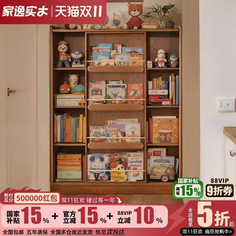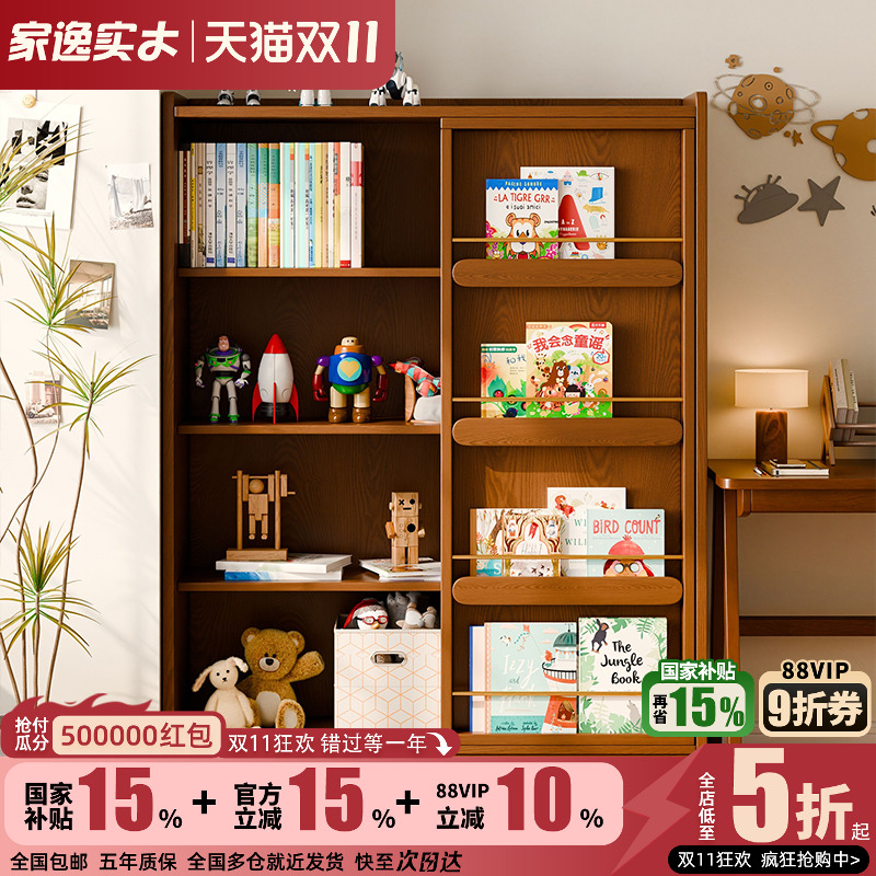 家逸实木书架落地儿童收纳绘本架靠墙推拉书柜储物柜一体储物柜子
