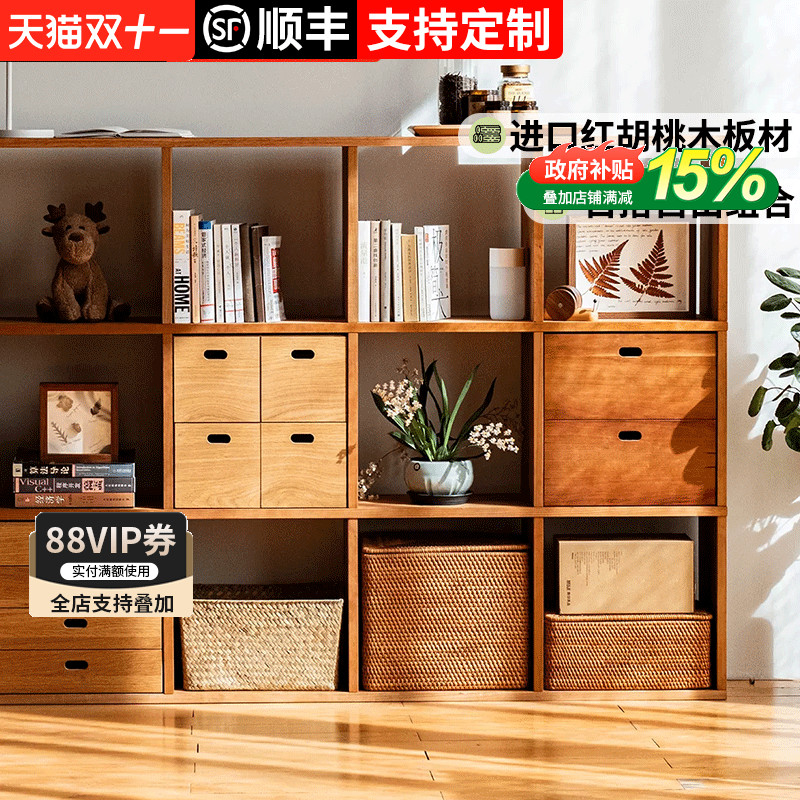 实木书架落地置物架儿童书柜储物柜一体日式胡桃木格子柜矮柜定制