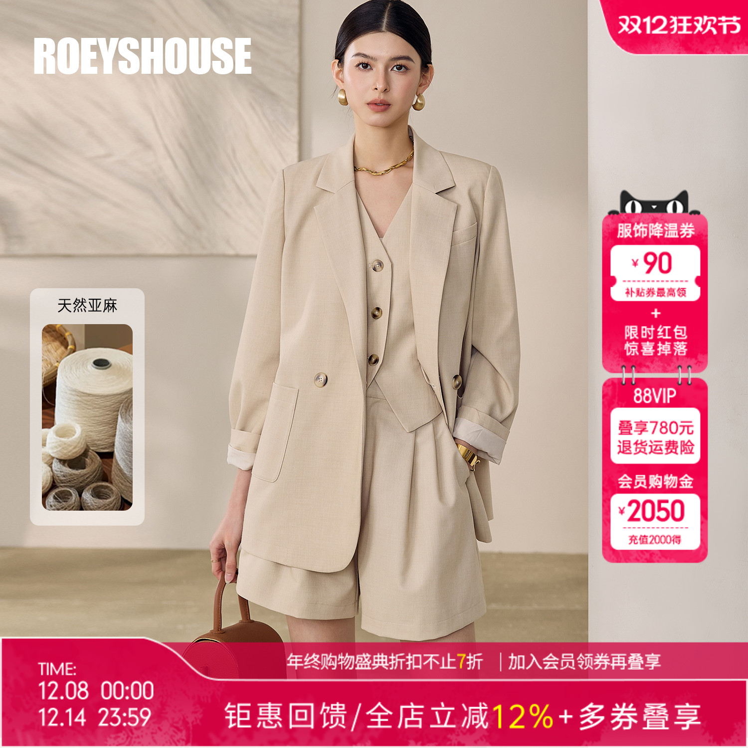 罗衣高级卡其色亚麻西装套装女2025秋季职业马甲短裤三件套12575
