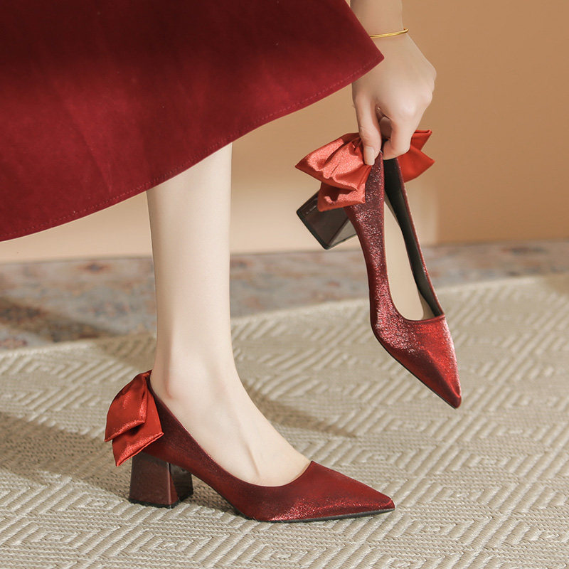 晚晚鞋法式粗跟高跟鞋尖头单鞋女2023新款春季中跟大码蝴蝶结女鞋