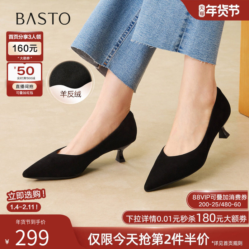 百思图2026春季新款羊皮绒面细跟高跟鞋尖头女浅口单鞋K5811AQ6