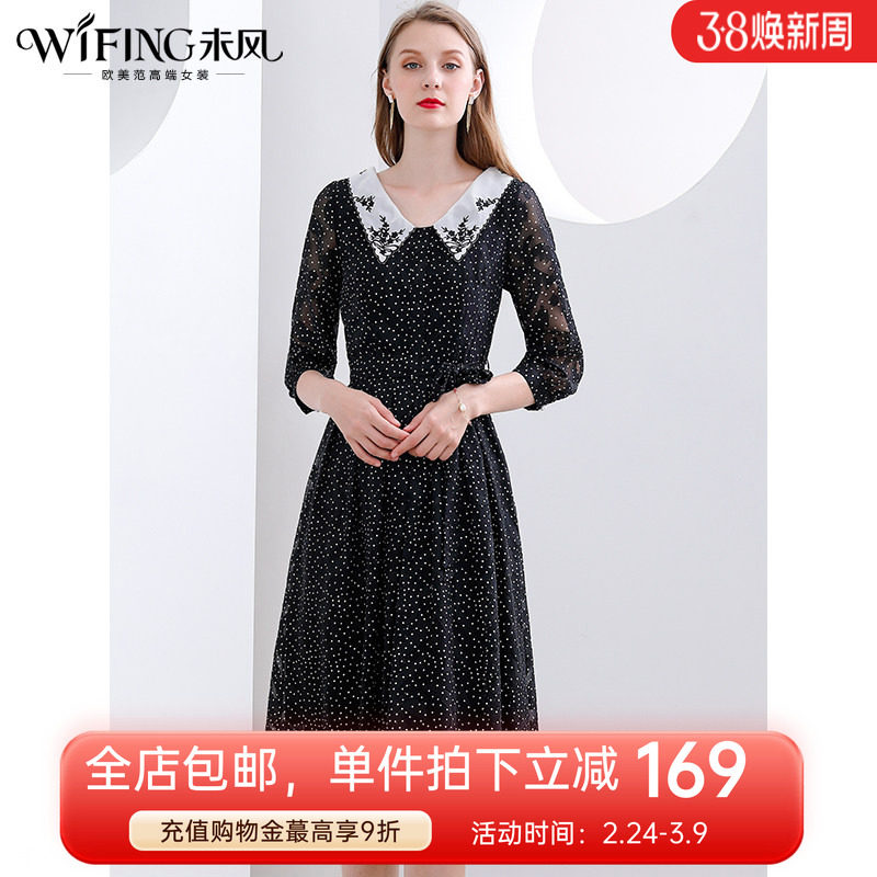 未风雪纺娃娃领连衣裙女2026春装新款黑色波点中长款气质春季裙子
