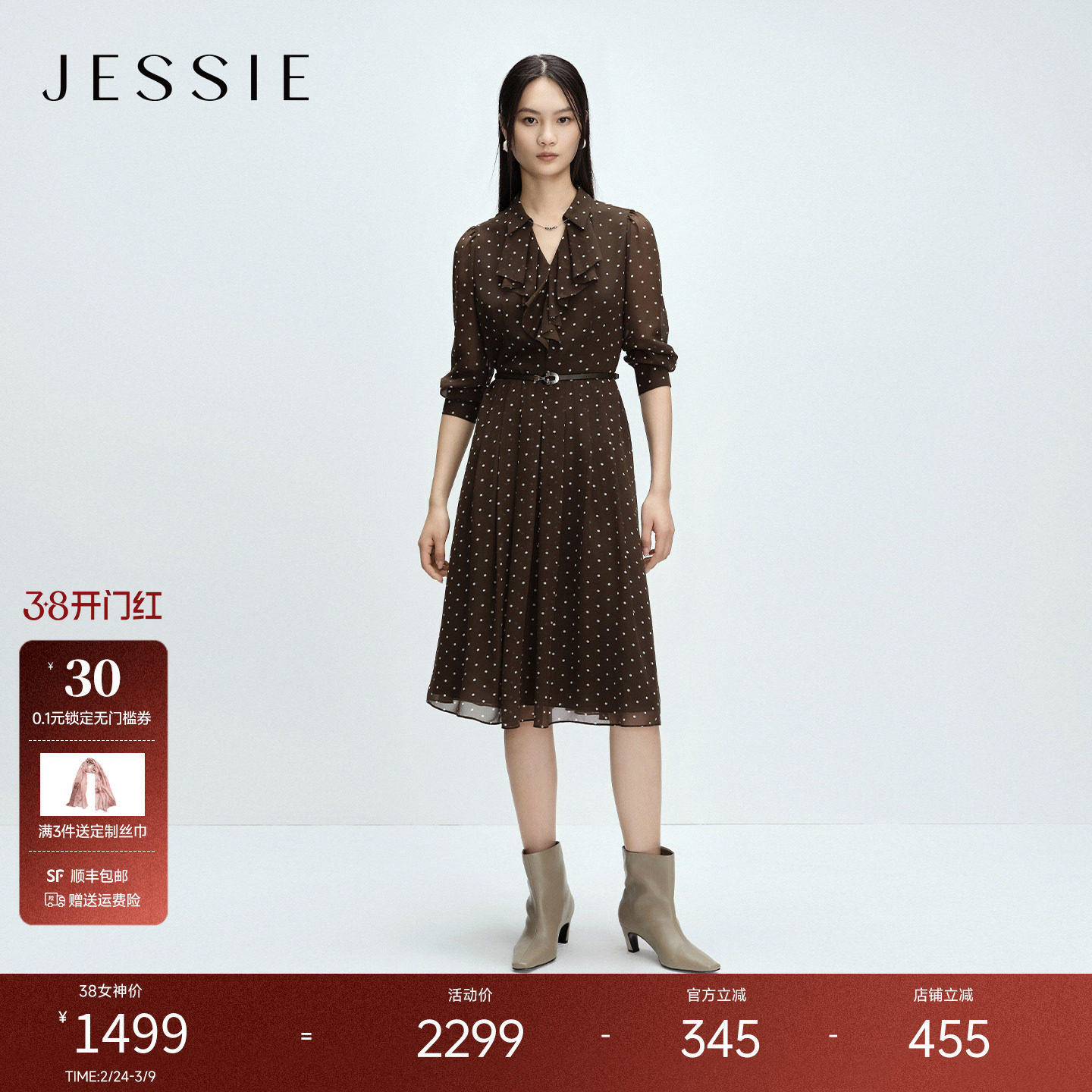 JESSIE复古波点雪纺连衣裙女长袖收腰荷叶领中长裙2025年秋季新款