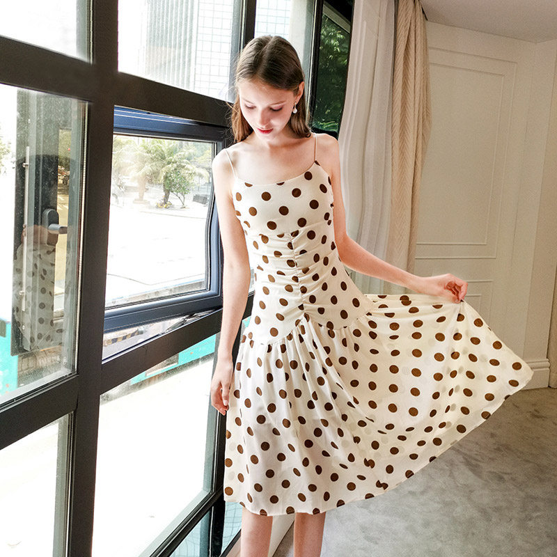 中长款雪纺波点带连衣裙女夏2024年夏季新款大裙摆洋气吊带中长裙