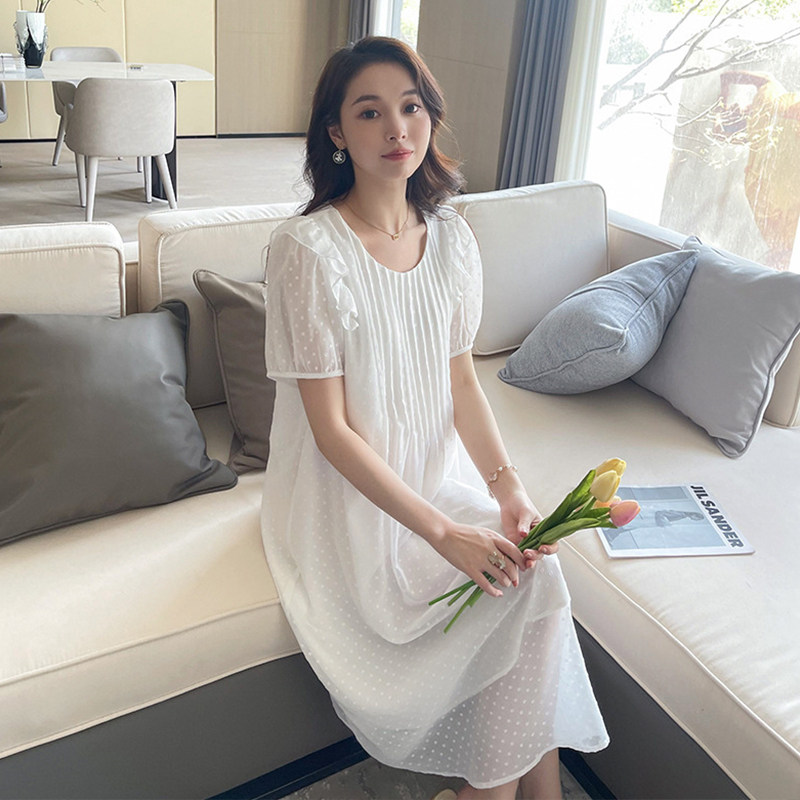 甜美木耳边连衣裙孕妇夏装气质圆领波点宽松潮辣妈薄款雪纺中长裙