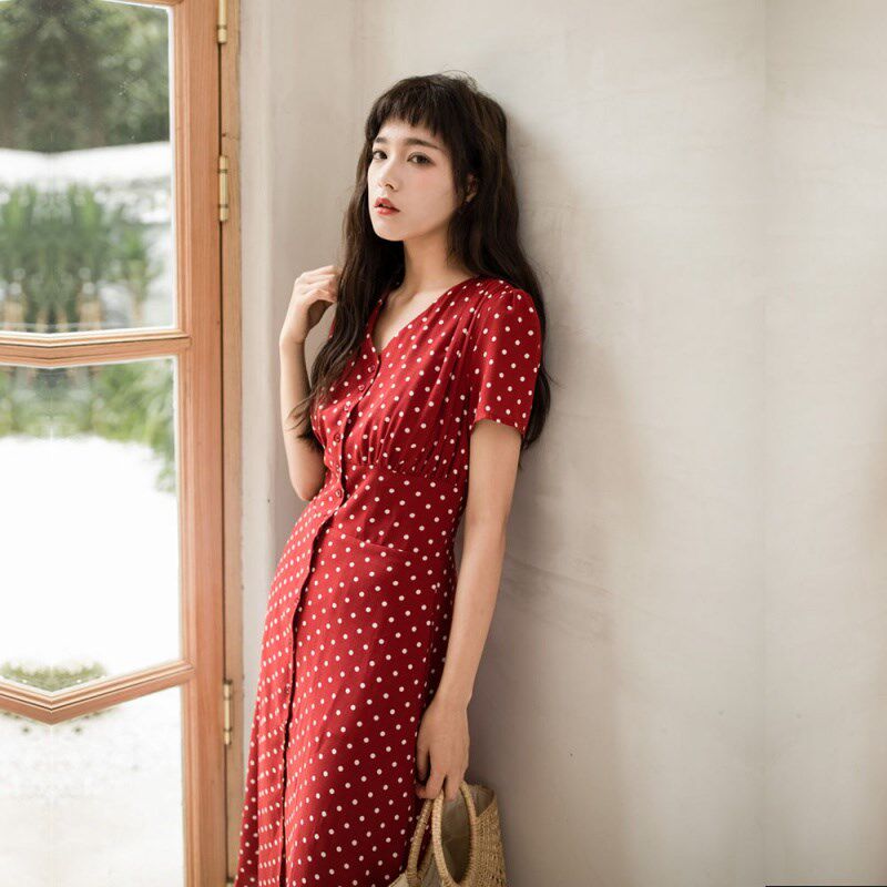 高端法式复古v领雪纺波点茶歇裙女红色高级感中长款a字连衣裙夏季