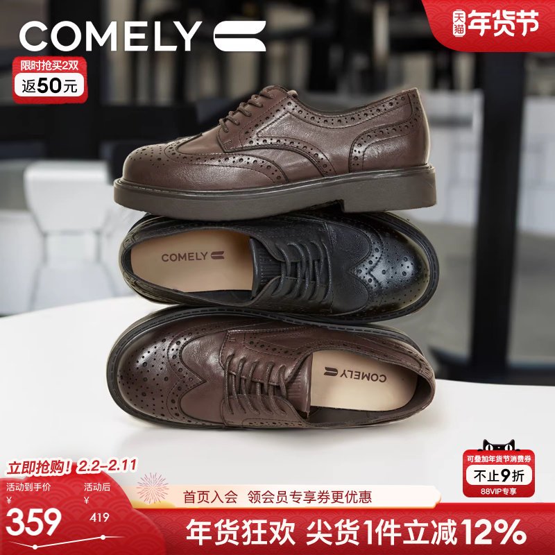 康莉真皮系带小皮鞋女2025年春季新款雕花布洛克英伦女鞋深口单鞋