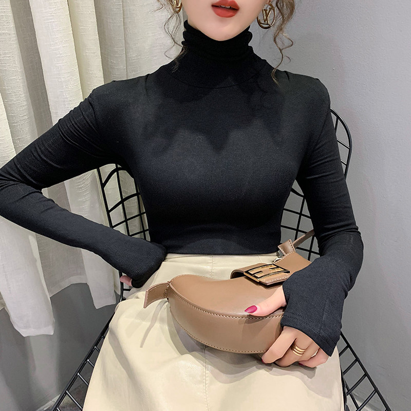 带手套的加长袖子打底衫女手指洞上衣秋冬加厚高领秋衣纯棉打底衣