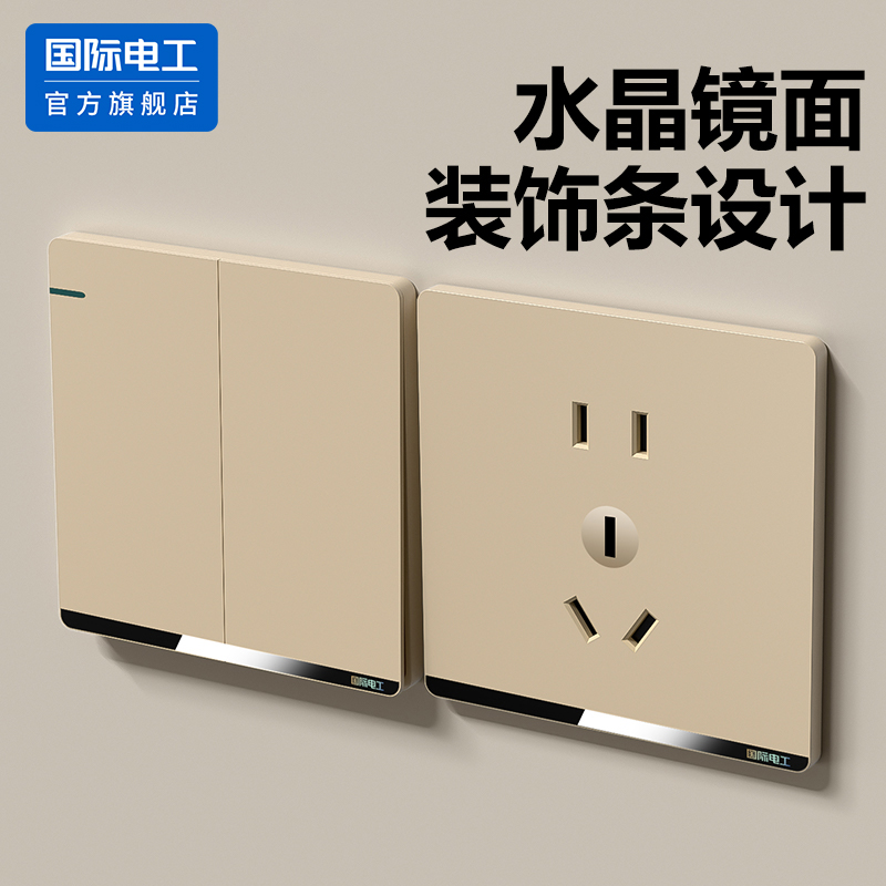 国际电工家用86型墙壁香槟金色开关插座面板一开单控五孔16a三孔