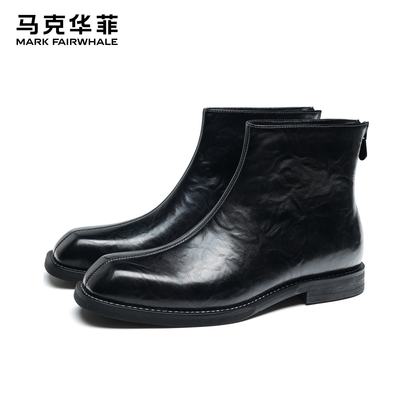 马克华菲切尔西靴男靴新款拉链黑色高帮真皮休闲方头皮鞋马丁靴男