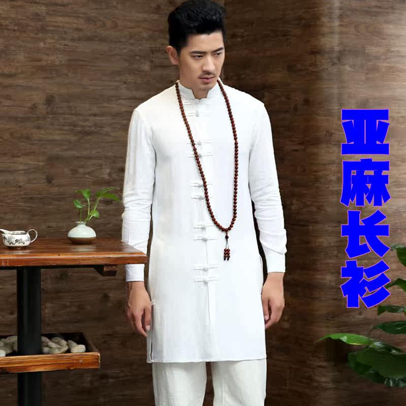 春亚麻唐装男长袖中长风衣男装修身中国风衬衫长衫衬衣胸105-125