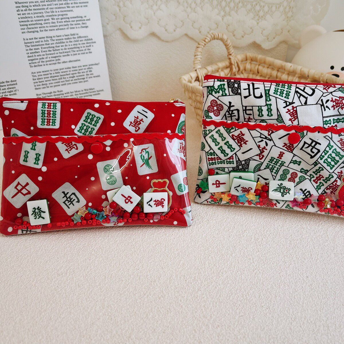 麻将印花棉布双层透明TPU流沙化妆包手机零钱包便携手包工厂批发