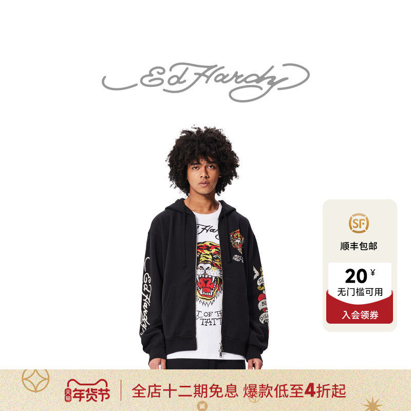 Ed Hardy埃德哈迪秋季新款美式复古虎头男士拉链开衫连帽卫衣
