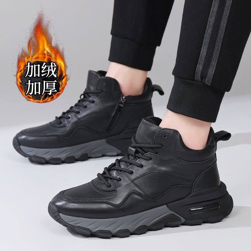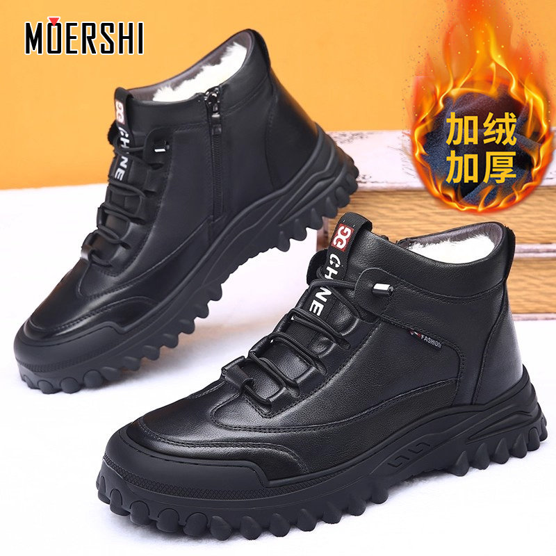 冬季新款男式加绒休闲鞋保暖头层真皮高帮短靴软底软面工装棉鞋男