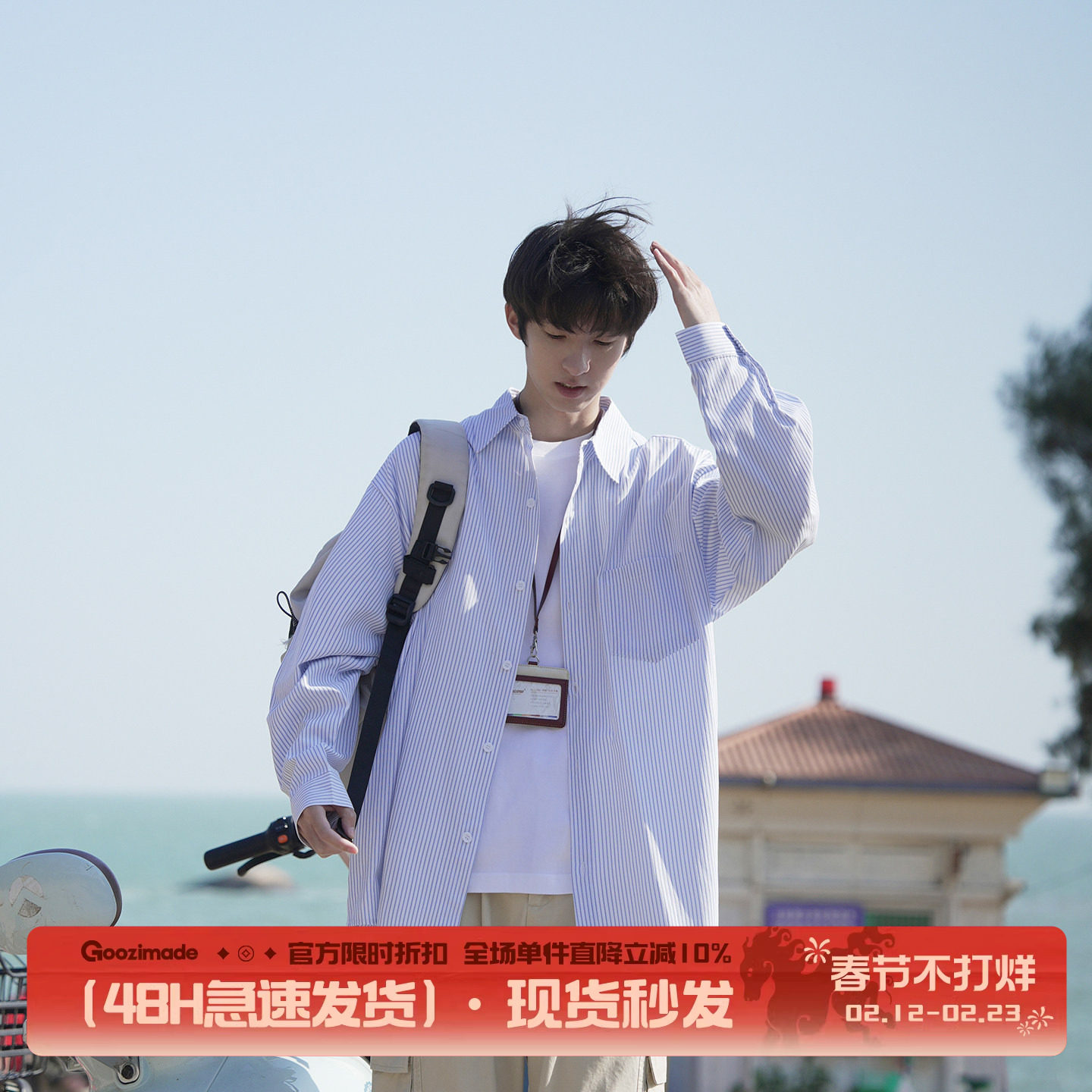 @港仔文艺男 日系复古蓝色条纹长袖衬衫男生春季宽松休闲衬衣外套