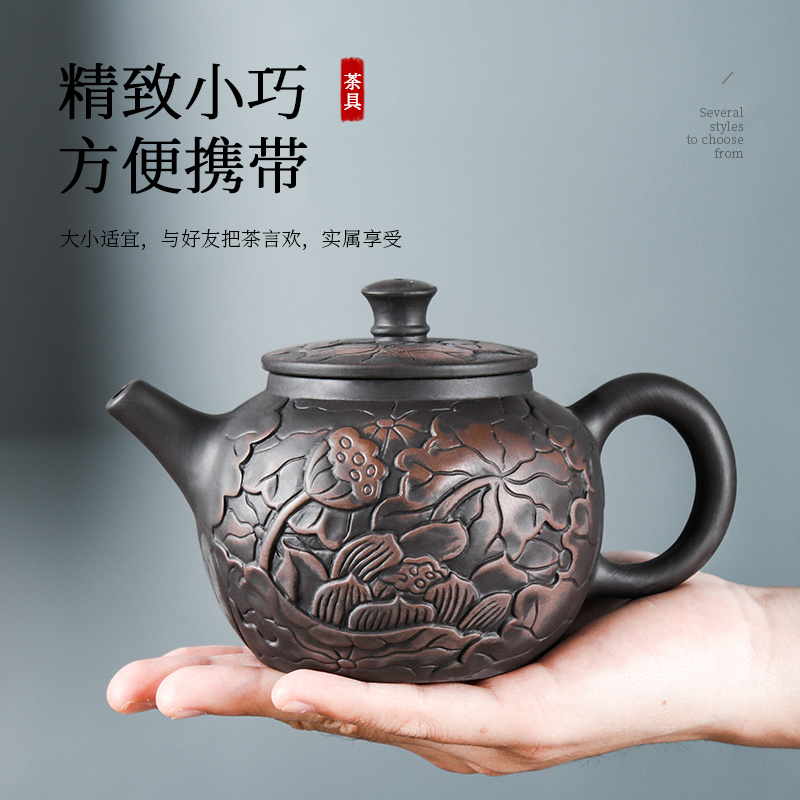 宜兴紫砂壶手绘仿古浮雕荷花壶大容量家用泡茶壶功夫茶具茶杯套装
