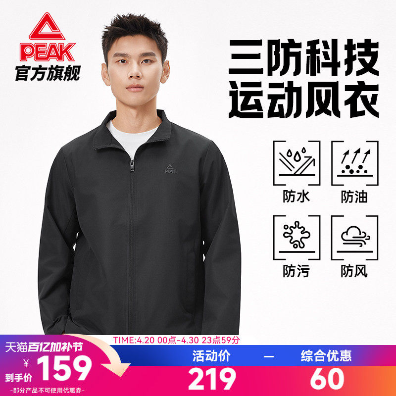 特步外套男士春季休闲冲锋男装防风训练黑色上衣男运动服夹克风衣