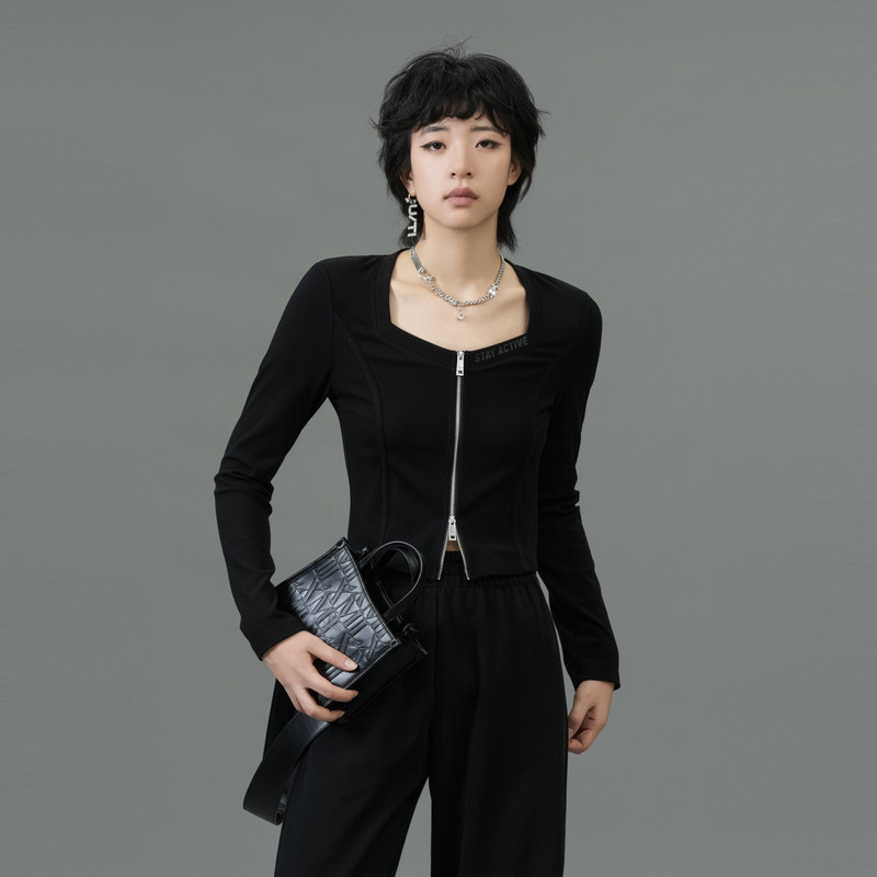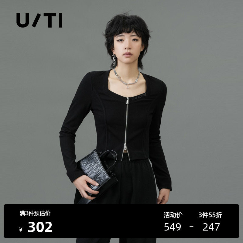 U/TI黑色方领垫肩高腰短款T恤女 百搭双拉链上衣尤缇2025春季新款