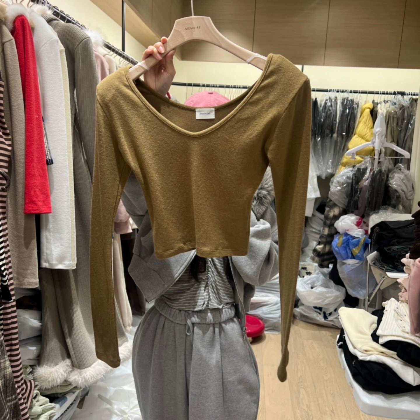韩国代购高腰短款t恤女2025秋冬深V领修身显瘦加厚磨毛长袖打底衫