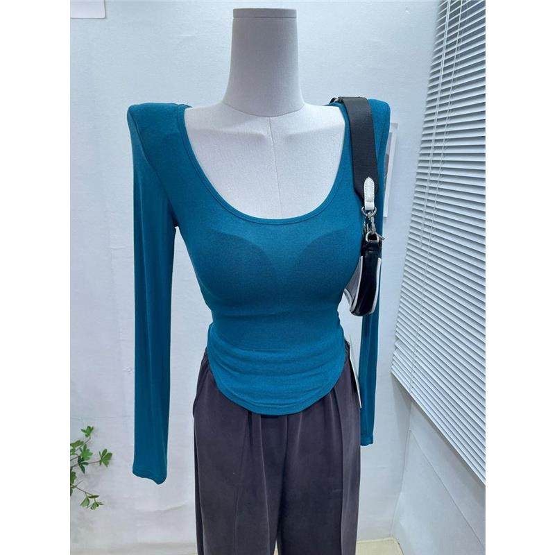 性感微透低胸U领长袖修身打底衫2025春装新款圆弧下摆高腰短款T恤